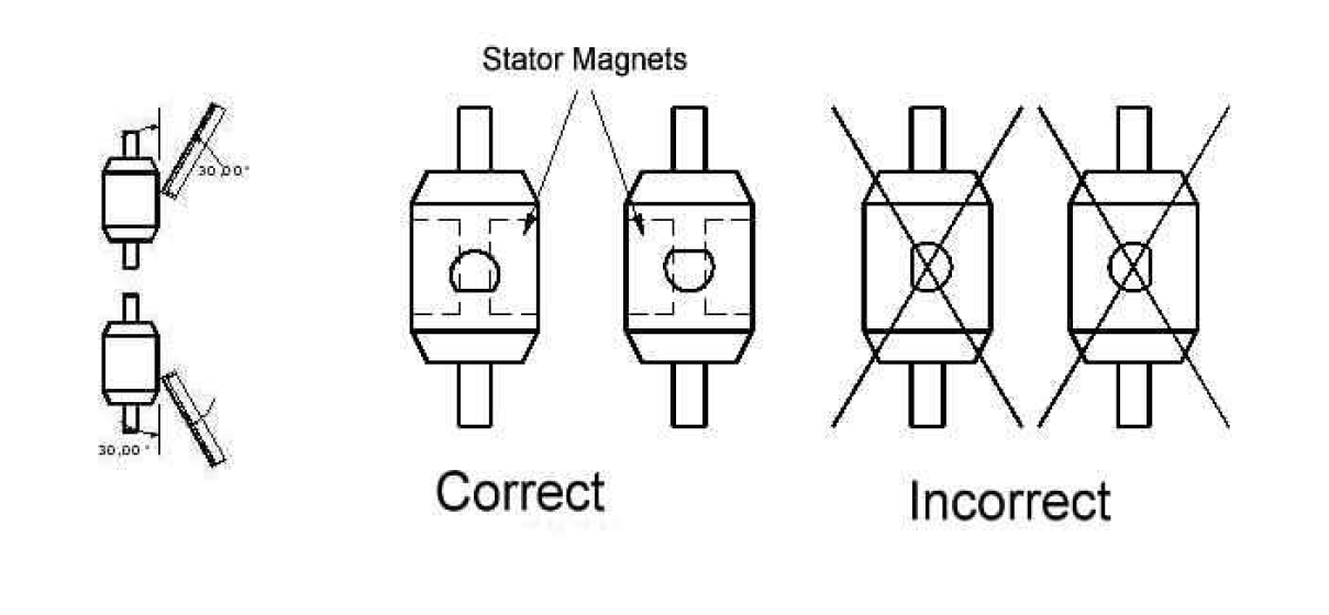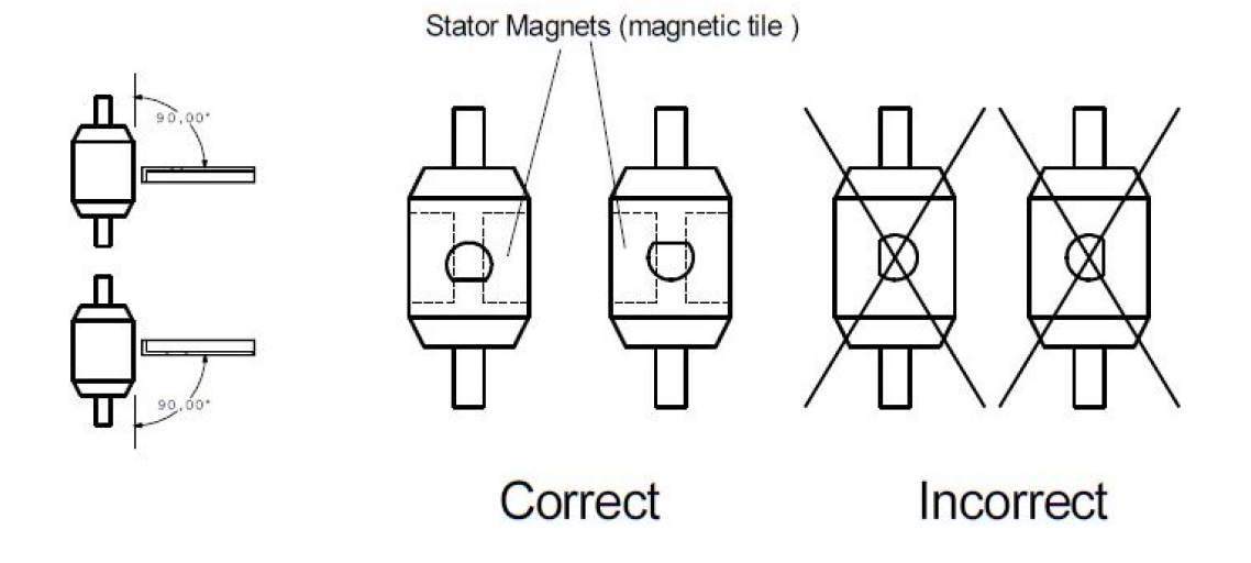 通常應(yīng)選擇兩個定子磁鐵之間的區(qū)域。不同型號的安裝角度如下: